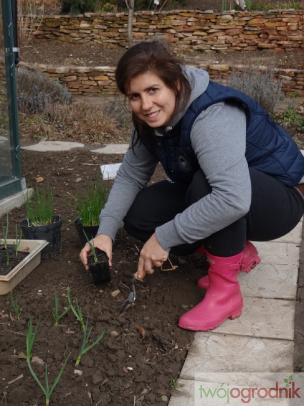 Alicja wysadza do gruntu czosnek, którego ząbki Andrzej w listopadzie posadził do doniczek.