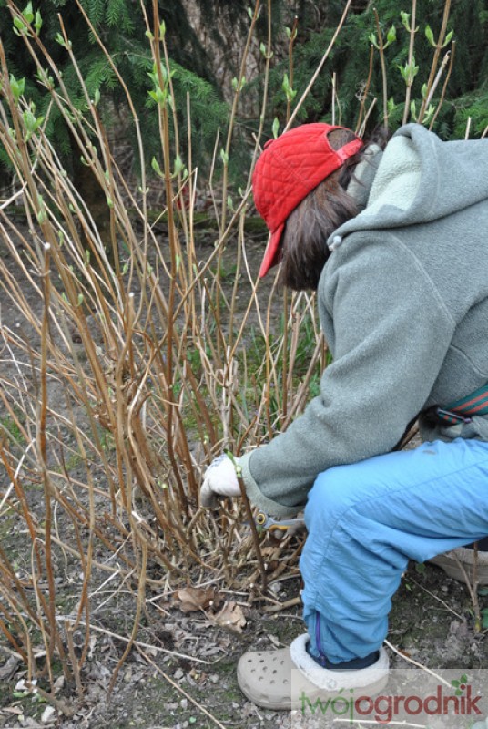 To już ostatni moment na przycięcie hortensji drzewkowatej (krzewiastej), bo już zaczęła rozwijać pączki. Lucyna usuwa wszystkie cienkie gałązki, a te grubsze skraca do 30 cm, tnąc 1 cm nad parą pąków