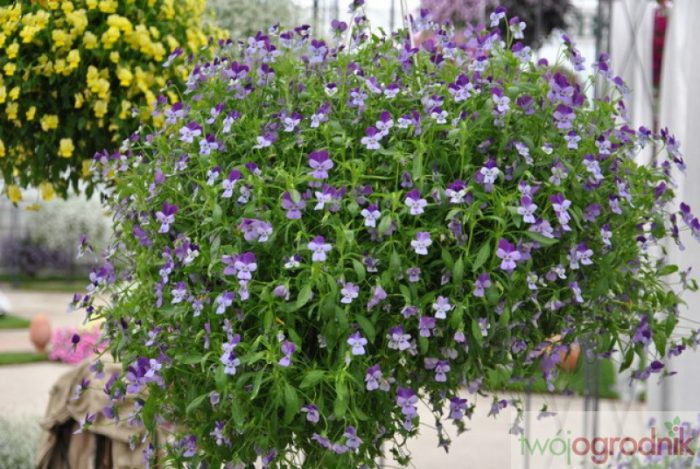 Fioletowe fiołki kaskadowe pięknie prezentują się w wiszących donicach