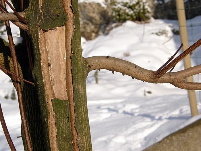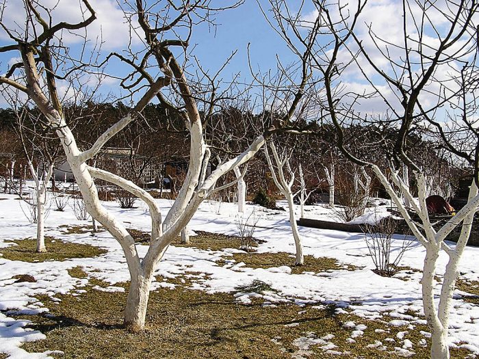 Choć tego nie widzimy, w lutym już krążą soki w drzewach, szczególnie podczas słonecznych dni. Pnie niepomalowane na biało wapnem (powinniśmy zrobić to już pod koniec grudnia), bardzo się nagrzewają i pękają podczas mroźnych nocy. Wówczas powstają rany zgorzelinowe, które powinny być leczone maściami ogrodniczymi typu Funaben. Suche fragmenty należy zeskrobać, a ranę zasmarować, aby nie dopuścić do jej zainfekowania groźnymi grzybami. Można także połączyć dolną i górną część rany poprzez szczepienie pomostowe za pomocą pędów jednorocznych pobranych z korony drzewa. Młode drzewa mogły zostać także obgryzione przez gryzonie czy sarny. Jeżeli rany są niewielkie, wystarczy zasmarować pędy maścią, a na młode drzewka założyć specjalne opaski.
