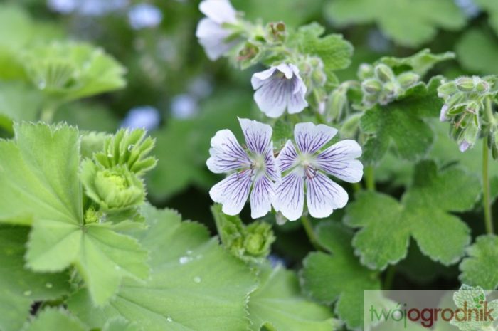 Na niższych rabatach możecie posadzić bodziszek Renarda, który wyróżnia się zupełnie innymi liśćmi. Są zaokrąglone, a ich powierzchnia nie jest gładka, gdyż blaszki liościowe są poprzecinane bardzo gesto ułożonymi nerwami, tworzącymi siatkę. Dlatego liście sprawiają wrażenie szorstkich i matowych. Są trwałe i dekoracyjne przez cały sezon. Kwiaty rozwijają się w czerwcu, są białe z fioletowo-purpurowymi żyłkami.