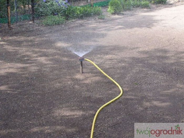 Po wysianiu podlej trawnik drobnym zraszaczemZapamiętaj! Nie można dobrze podlać trawnika z węża trzymanego w ręku. Musisz zamontować zraszacze,które będą łagodnie nawilżały darń. Najlepiej podlewać wcześnie rano lub wieczorem, aby woda zbyt szybko nie wyparowała. Dobre podlanie trawnika oznacza, że woda zdołała nawilżyć warstwę o głębokości 15 cm. Dlatego lepiej podlewać dłużej co kilka dni, niż krótko codziennie.