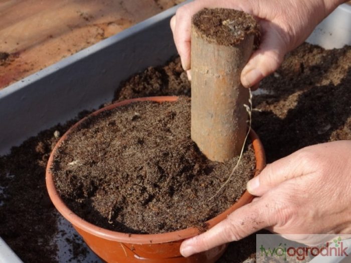 9 Wałkiem lekko ubijamy podłoże w doniczce