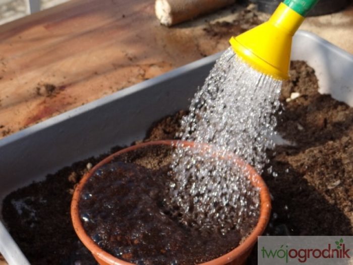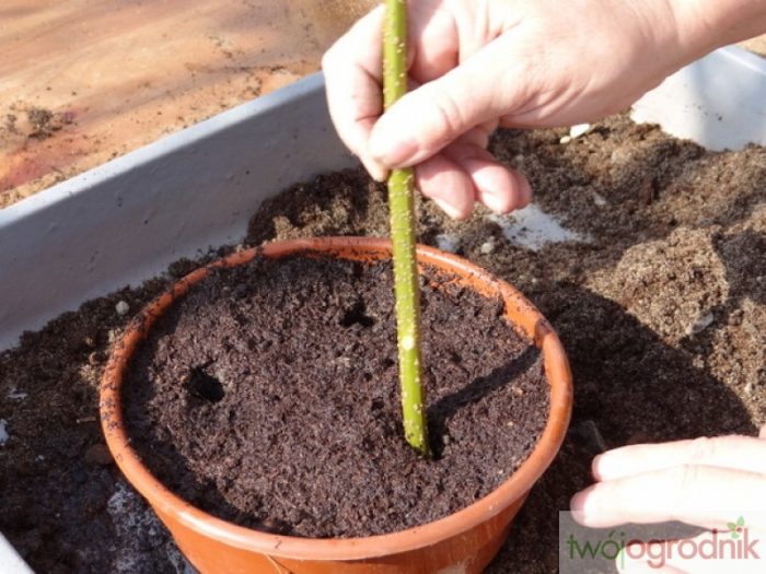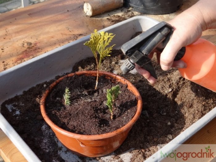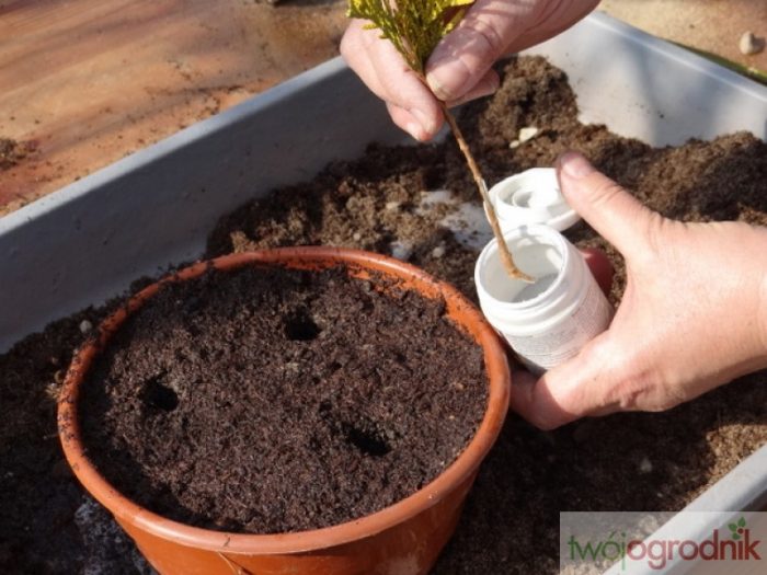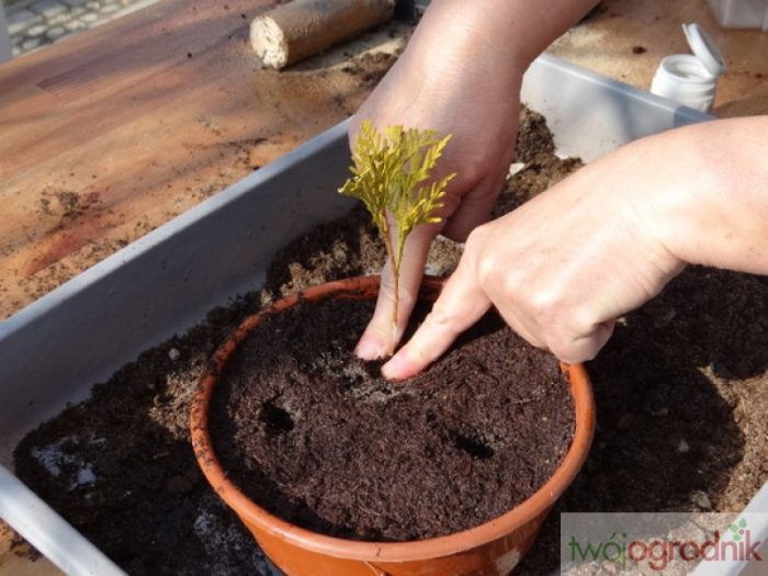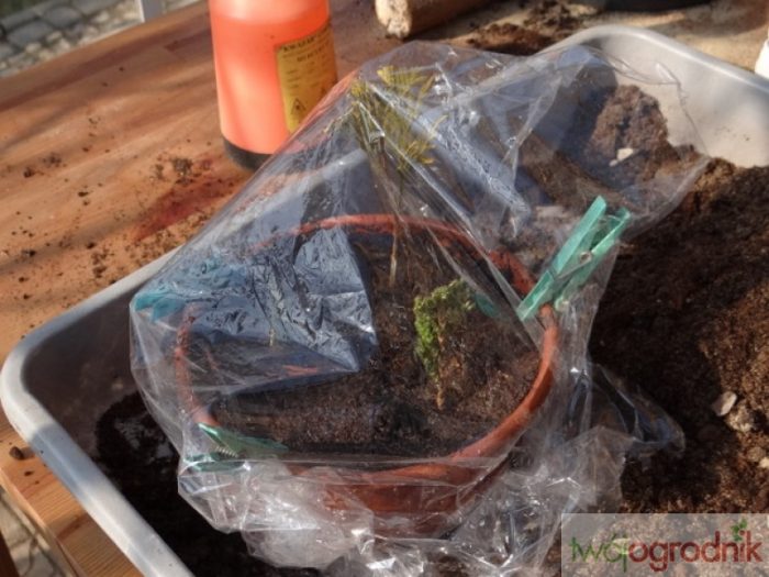 Przed posadzeniem zanurz dół sadzonki w sproszkowanym ukorzeniaczu do roślin iglastych. Nie wciskaj sadzonek do ziemi, zrób najpierw dziurkę patyczkiem (aby ukorzeniacz nie starł się), włóż w nią sadzonkę i uciśnij ziemię wokół sadzonki palcami. Sadzonki trzeba zrosić i nakryć folią, aby zapewnić im podwyższoną wilgotność powietrza, a tym samym lepsze warunki do ukorzeniania. Podłoże powinno być tylko lekko wilgotne, dlatego uważajmy z podlewaniem. Doniczki z sadzonkami powinny stać w zacienionym miejscu w szklarni, bo bardzo łatwo może je przypalić słońce