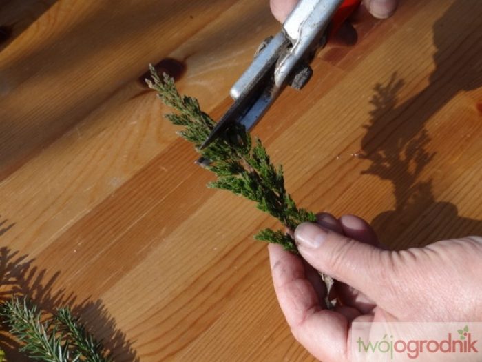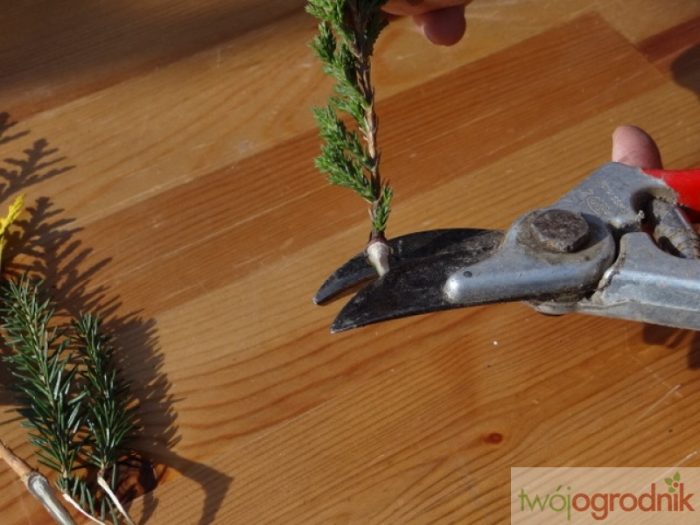Odrywaj je ręką w ten sposób, by na dole została tak zwana piętka, czyli kawałek starszej gałązki. Następnie lekko przytnij sekatorem piętkę, skróć górną część sadzonki, z dolnej części nad piętką ( na odcinku około 3 cm) oderwij igły.